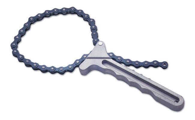 A chain filter wrench with up to 125mm diameter supplied with a lightweight Aluminium handle.