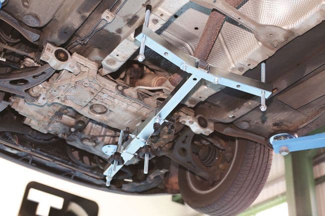 Introducing the Laser Tools 5750 Engine/Gearbox Support – the ultimate solution for transverse-engined vehicle repairs. This versatile frame is designed to securely hold the engine and/or gearbox during essential operations such as clutch and gearbox removal, DMF changes, engine and gearbox mount replacements, or cam belt replacements. With the ability to adjust the engine/gearbox position and height from underneath the car while on a ramp, this support frame offers maximum convenience and efficiency. Its length of 600mm to 930mm (fully extended) and adjustable thrust pins, mounting support hooks, and main support pad make it suitable for a wide range of applications. With a maximum load capacity of 400kg and maximum width of 300mm (position 1) or 500mm (position 2) for the thrust pins, you can rely on this frame for heavy-duty tasks. Elevate your vehicle repair game with the Laser Tools 5750 Engine/Gearbox Support.