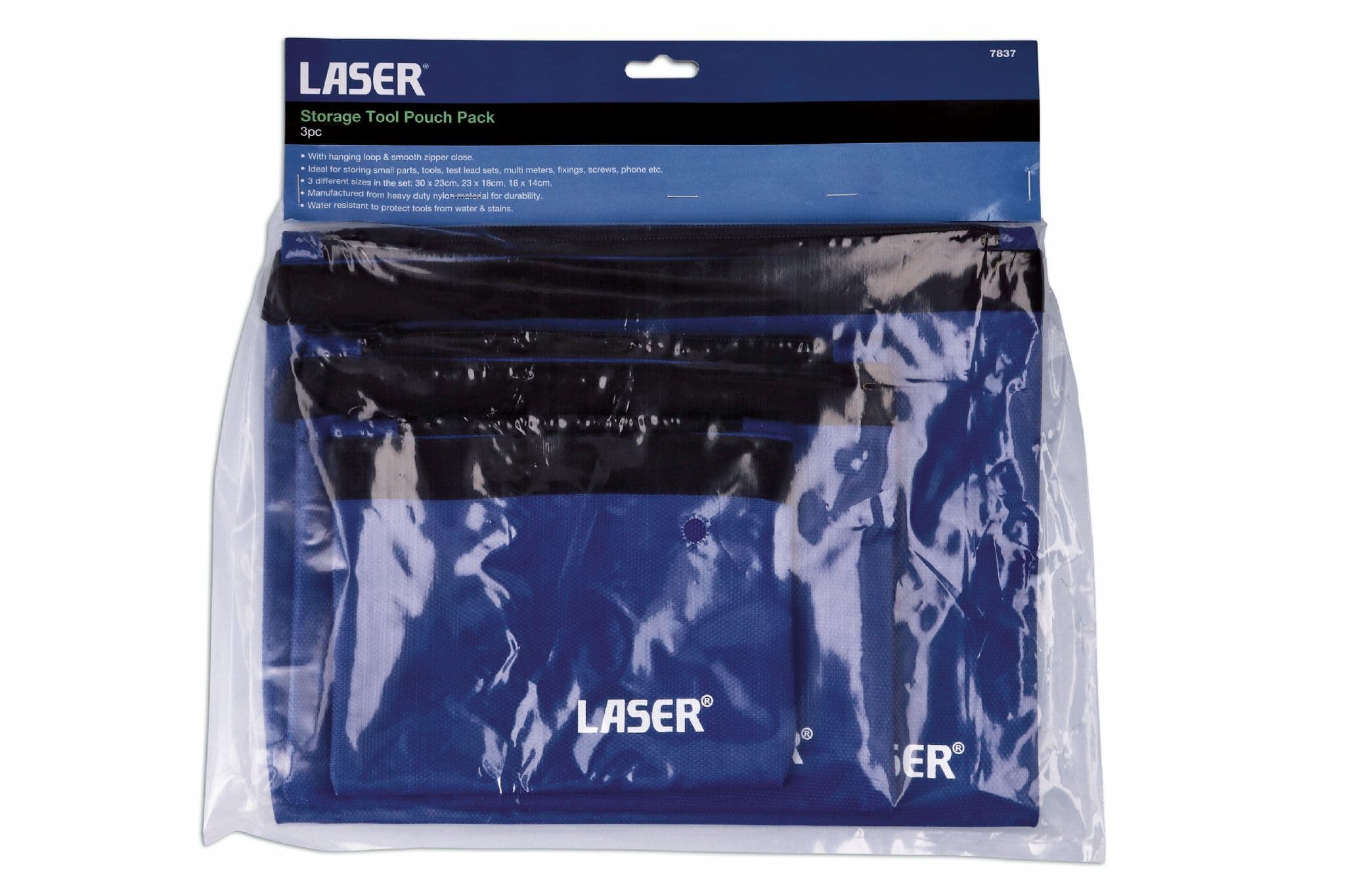 Elevate your organization and efficiency with the Laser Tools 7837 Storage Tool Pouch Pack 3pc. Made from heavy duty nylon material, these three multi-purpose pouches are built to withstand the toughest tasks. The hanging loop and smooth zipper close allow for easy access and convenient storage of small parts, tools, test lead sets, multi meters, fixings, screws, phones, and more. With three different sizes included - 30 x 23cm, 23 x 18cm, and 18 x 14cm - this set has all your storage needs covered. Keep your tools safe and secure with the water-resistant design, protecting them from stains and water damage. Upgrade your tool organization game with the Laser Tools 7837 Storage Tool Pouch Pack 3pc.