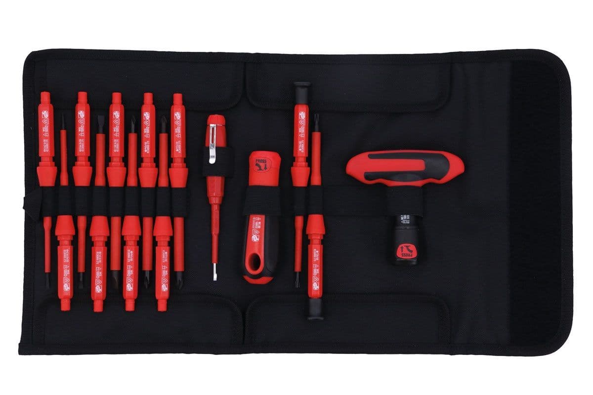 Featuring both a regular straight handle and a T-Handle driver, this set includes 11 screwdriver blades that easily lock into place for convenient interchangeability. Need to work with smaller screws? The 2 spinning end caps allow the blades to be used as precision screwdrivers. Plus, with the included circuit tester suitable for use from 110-250V AC, you can work confidently knowing your safety is a top priority.