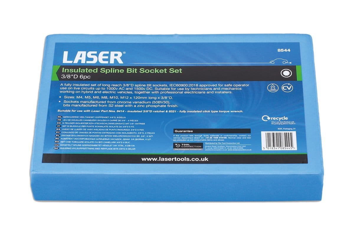 The Laser Tools 8544 Insulated Spline Bit Socket Set 3/8"D 6pc is an essential tool for technicians, mechanics, electricians, and installers working on hybrid and electric vehicles. These long reach 3/8"D sockets are fully insulated and manufactured to meet IEC60900 standards, ensuring safe operation on live circuits up to 1000V AC and 1500V DC. The set includes sizes M4, M5, M6, M8, M10, and M12, all 120mm long for versatile use. Made from high-quality materials, the sockets are chrome vanadium (50BV30) and the bits are S2 steel with a zinc phosphate finish. The set comes in a convenient EVA foam tray for easy storage and minimal packaging waste. It is designed to be used with the Laser Tools fully insulated 3/8"D ratchet and click type torque wrench for a complete and safe toolset. Upgrade your toolkit with the Laser Tools 8544 Insulated Spline Bit Socket Set.