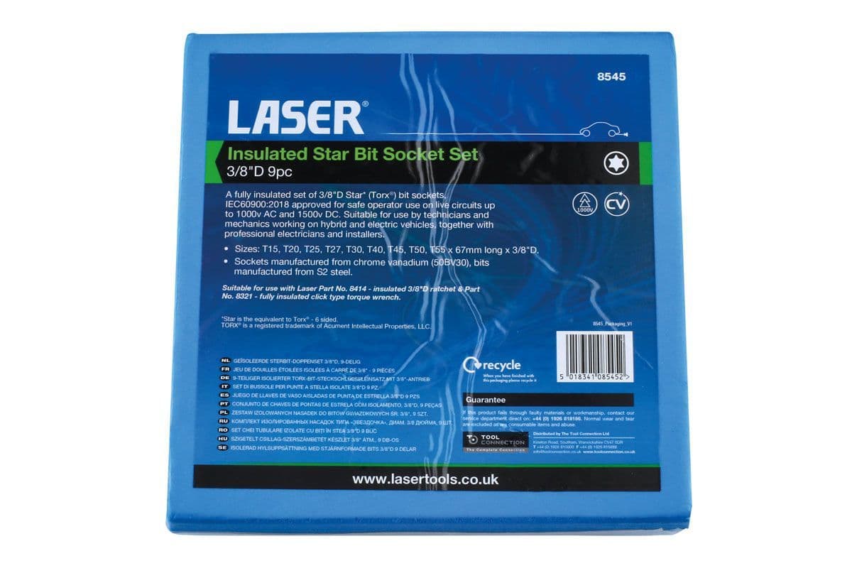 Introducing the Laser Tools 8545 Insulated Star Bit Socket Set, the ultimate solution for professionals working with live circuits. This 9-piece set is fully insulated according to IEC60900:2018 standards, making it safe for use on live voltages of up to 1000V AC and 1500V DC. Perfect for technicians, mechanics, electricians, and installers, this set is a must-have for those working on hybrid and electric vehicles.