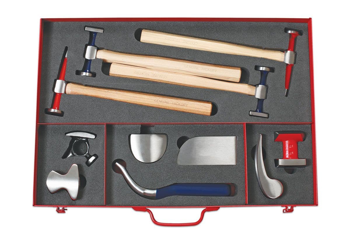 Included in this comprehensive set are a variety of hammers, including cross pein, finishing, shrinking, bumping, and pick hammers. The range of dollies is equally impressive, featuring ring, utility, toe, heel, curved, and double-ended options, along with a useful moulding spoon. Each tool is also available for individual purchase.