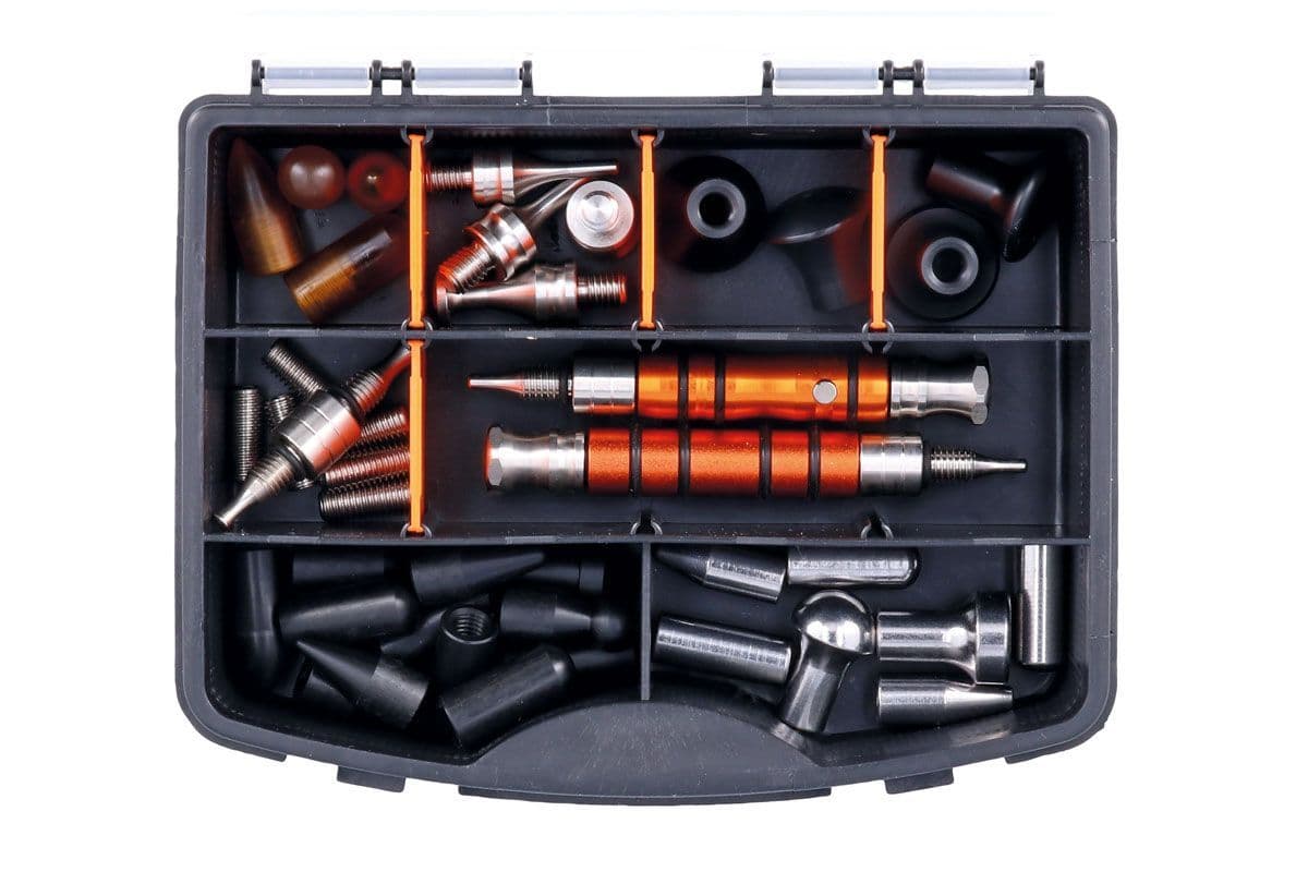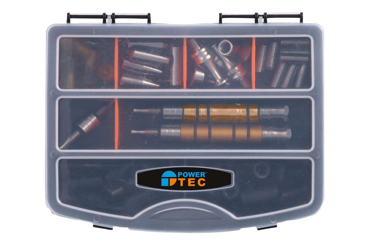But that's not all - the Power Tec 92689 PDR Tap Down Kit also comes with an assortment of interchangeable heads for even more versatility. With 16 hard plastic (POM) heads, 4 thermoplastic (PEI) heads, 7 carbon steel heads, 4 stainless steel heads, 3 reversible stainless steel heads, and 6 thread adaptors, you'll have everything you need to tackle any dent or ding with ease. And to make storage and organization a breeze, this kit comes in a convenient plastic storage box.